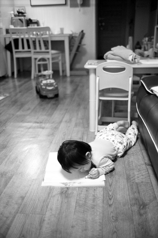 수아, 엎드려 그리는 자세가 특이합니다. ^ ^