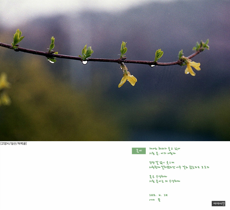 수상하다..... 이제껏 봄을, 봄비를 수상히 여겨본적이 없었는데 또다른 시각을 일깨워 주셨네요.