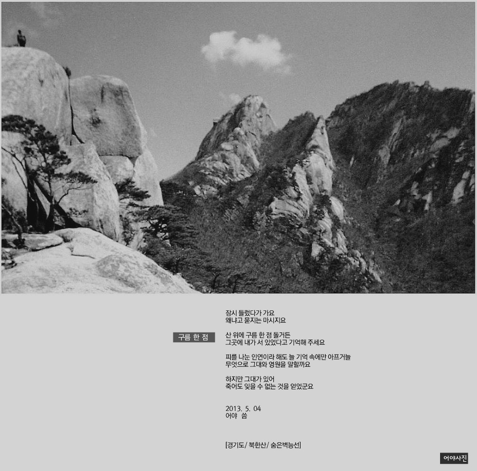 평지같이 걸어오르는 사람들이 부렀웟던 때가 있었읍니다. 혹시 어야도 자일 잡지 않고 성큼 성큼