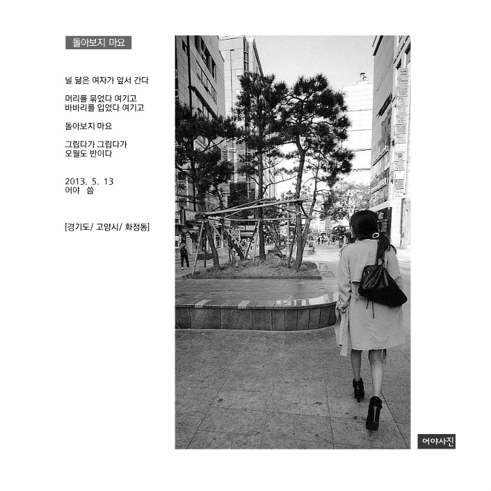 흑백으로 인해 간결한 느낌이 너를 닮은 그녀의 뒤태가 무척이나 아름답게 느껴지네요.