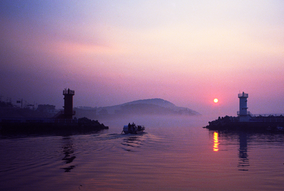 해 뜰때 포구의 방파제를 빠져 나가는 어선이 한폭의 그림같습니다.