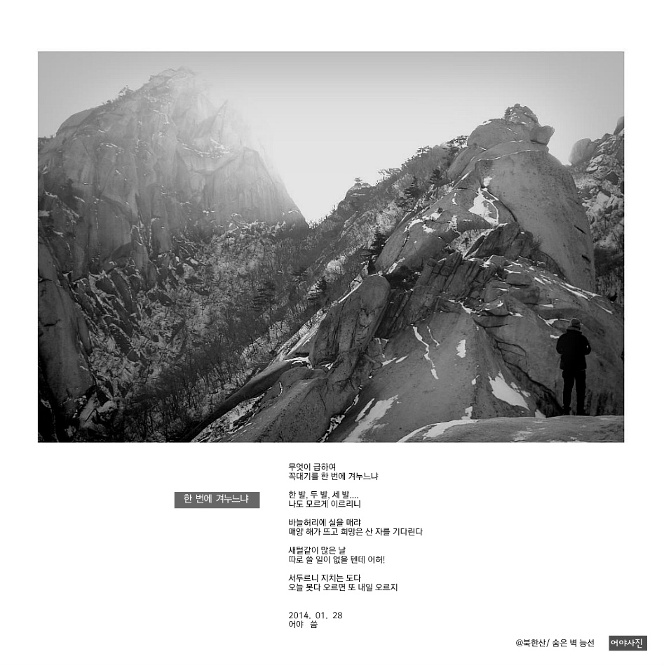 숨은벽 앞 바위에서 바라본 작품 같읍니다. 따뜻한 방에서도 오싹 추워지는 느낌 입니다. 감사 !