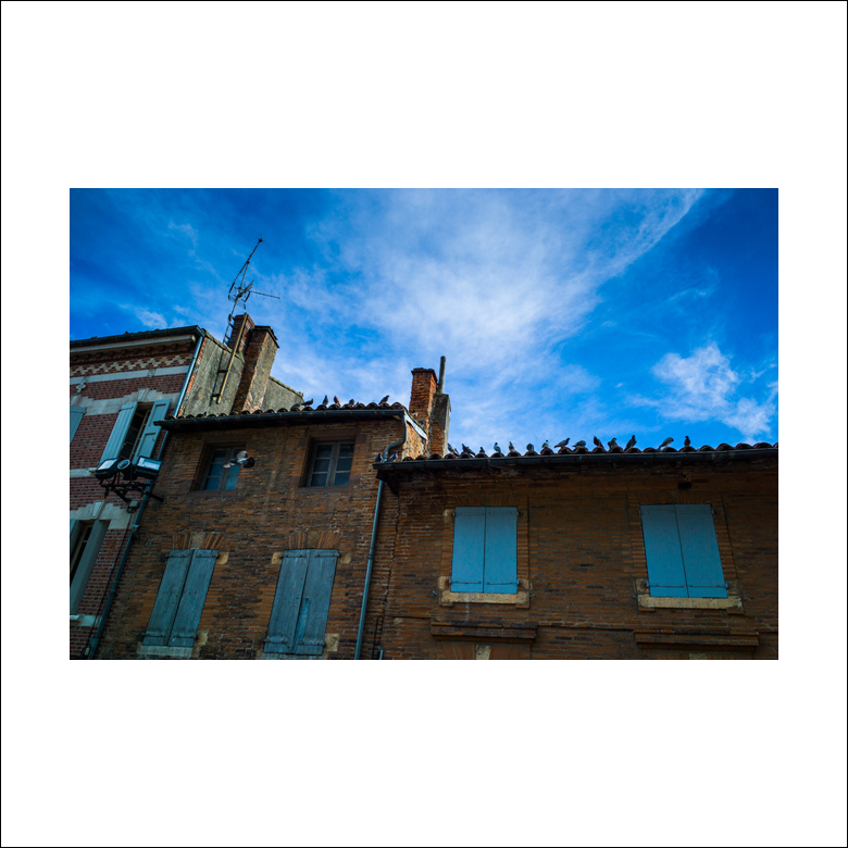 지붕선 위에 도열해 있는 비둘기들과 하늘색이 멋진 대비를 보여줍니다.