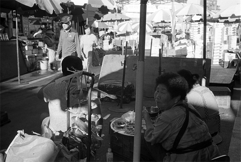옹색한 곳에서..식사를 하는 모습과 너머로 보이는 장터모습에서