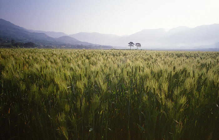 광할하게 펼쳐진 보리밭에 덩그러니 놓여 있는 두 그루의 나무 뒤로 또 보이는 산세들...