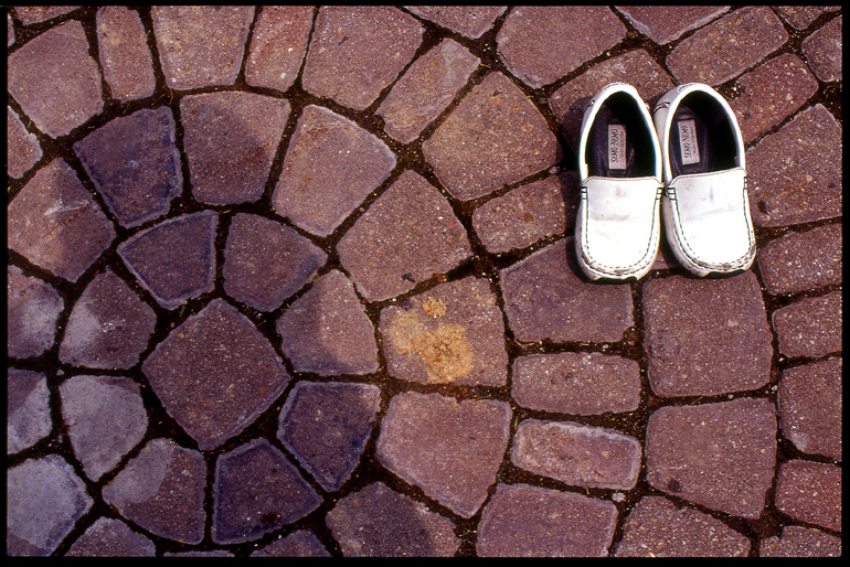질서 정연한 바닥 무늬에 좌우로 엇놓여있는 흰 신발이