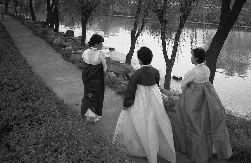 고운 한복의 여인과 버드나무와, 소박한 길..
