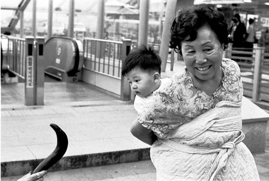 아기가 무언가??? 아기에게 가지를 넘겨주는....지하철 입구에서