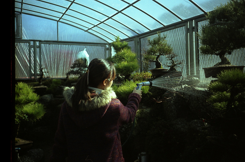 추운 겨울 털옷을 입고 아침 햇살을 받으며 분재에 물을 주는 여인이 아름답게 보입니다.