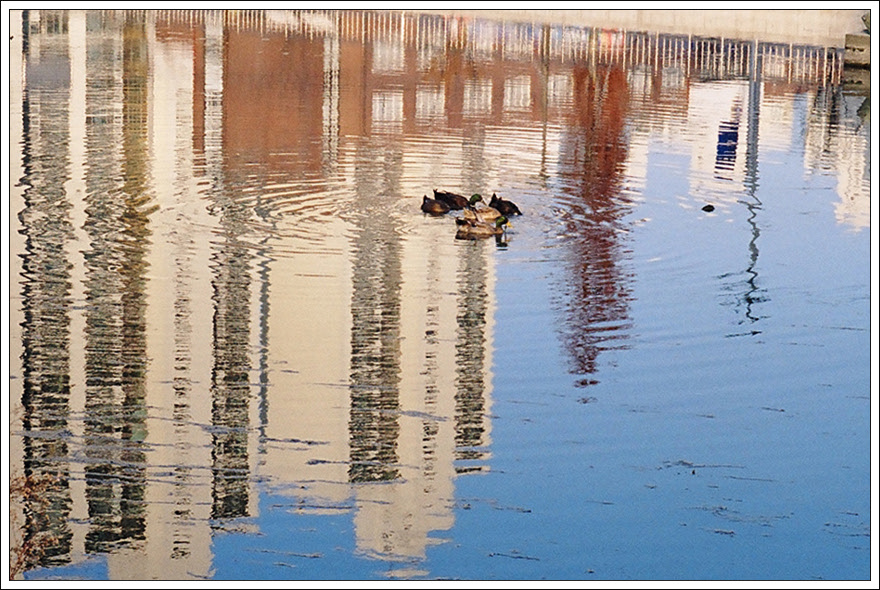 반영된 그림자를 희롱하는 오리들의 헤엄
