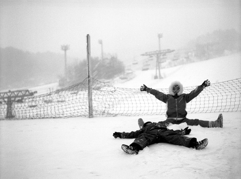 눈이 내리는 스키장, 즐거운 추억의 한 때입니다.
