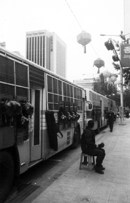 데모하는 학생들 근처의 어느 전투 경찰의 한가함...