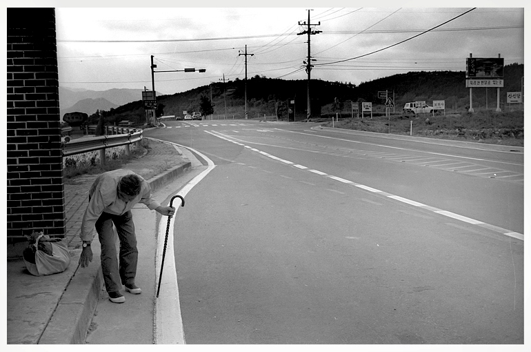 한적한 시골국도변의 버스정류장에서 앉을 자리를 챙기는 노인의 모습이 인상적이군요. 좋은 사진 잘 보았습니다.