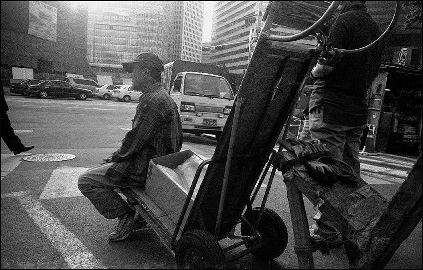 명칭이 숭례문상가라고 하니까 왠지 어색하게 느껴지네요. 제게는...(남대문시장^^). 쉬고 있는 지계와 손수레에 걸터앉아있는 남자의 모습이 아주 실감나게 보입니다. 흑백의 톤도 묵직하고 좋습니다. 좋은 사진 잘 보았습니다.