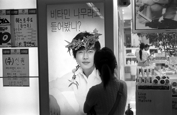그런데 밥 먹고 다시 보니 나르시소스 같습니다. 그래야 권상우가 주위를 전혀 의식하지 않는 것처럼 시선처리를 한 것과도 맞아떨어집니다. 그럼 저 아가씨는 나르시소르를 짝사랑한 그 어느 여인이 되겠군요. 이런 광경을 "광고홍수시대의 신화"라 해야 할지... 이인한 선생님의 그야말로 정곡을 찌르는 멋진 작품입니다. 그런데 나르시소스가 "~~ 들어봤니?" 하고 상냥하게 말을 걸 것 같지는 않습니다.^^