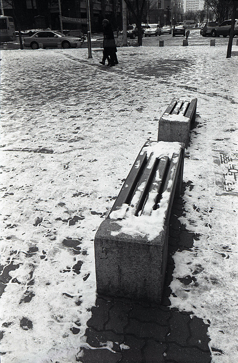 앉는 이 없는 눈 덮힌 벤치가 더 추워 보입니다.