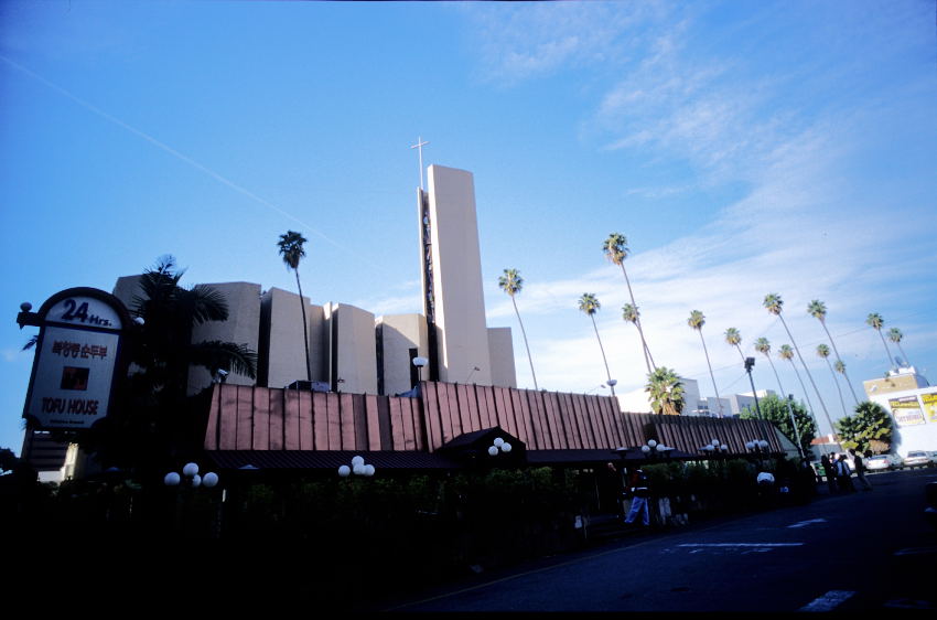 이국적인 모양을 한 나무들이 있는 한인교회...